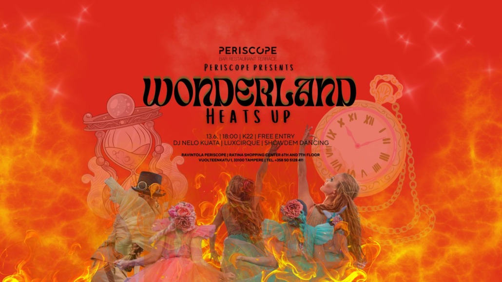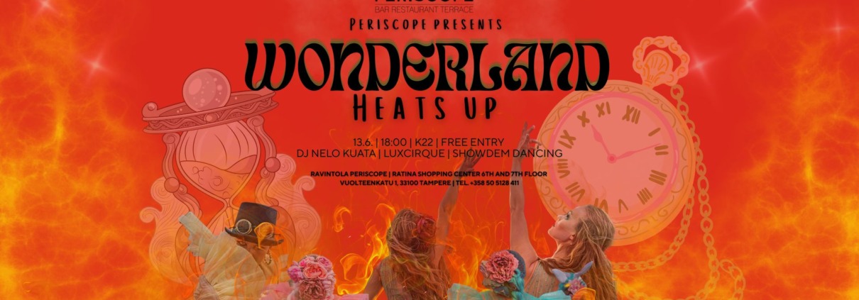 Suuren suosion saanut Wonderland-tapahtuma muuttaa jälleen kerran Periscopen kattoterassin surrealistiseksi maailmaksi 13.6. Illan aikana voit nähdä toinen toistaan maagisempia esityksiä ja kohdata hullunkurisia hahmoja. Tällä kertaa Wonderland Heats Up, tule ottamaan selvää, mitä se tarkoittaa!